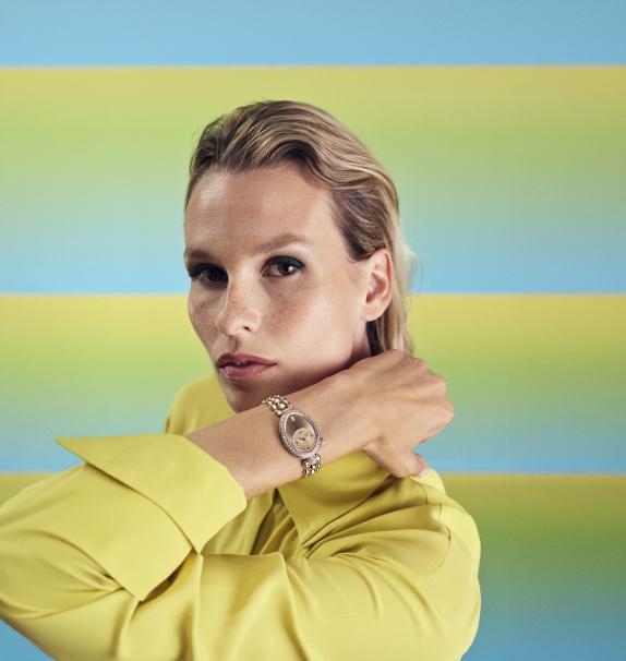 两款新品腕表配备该表链,分别是白色珍珠母贝表盘款式和密镶钻石表盘款式(镶嵌1,387颗钻石及1颗蓝宝石,总重5.2克拉)。蓝色砂金石玻璃表款则配以缎面润饰的蓝色鳄鱼皮表带,而白色珍珠母贝表款亦提供同款表带可供选择。