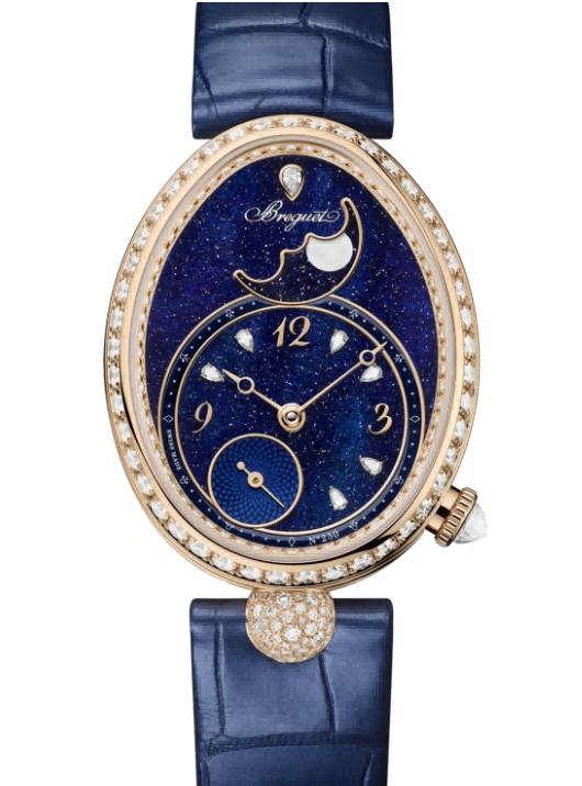 月相以白色珍珠母贝制成,微微拱起,在蓝色砂金石玻璃的映衬下散发莹润光泽。这一设计在Reine de Naples那不勒斯王后系列中亦是首次出现。此外,腕表亦配有宝玑隐形签名。完全透明的星星表面在珍珠母贝下以白色描绘。唯有佩戴者近距离细察方能辨认。