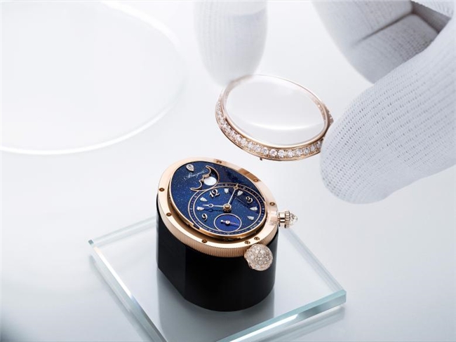 为进一步凸显砂金石玻璃本身的璀璨光泽,宝玑特地在其下方添加了纤薄的大溪地珍珠母贝。珍珠母贝流转多姿的虹彩,与蓝色砂金石玻璃中铜屑的熠熠微光交相辉映,使 Reine de Naples 那不勒斯王后系列腕表仿若笼罩在梦幻迷离的朦胧夜色之中,精致的月相显示亦更显柔美动人。