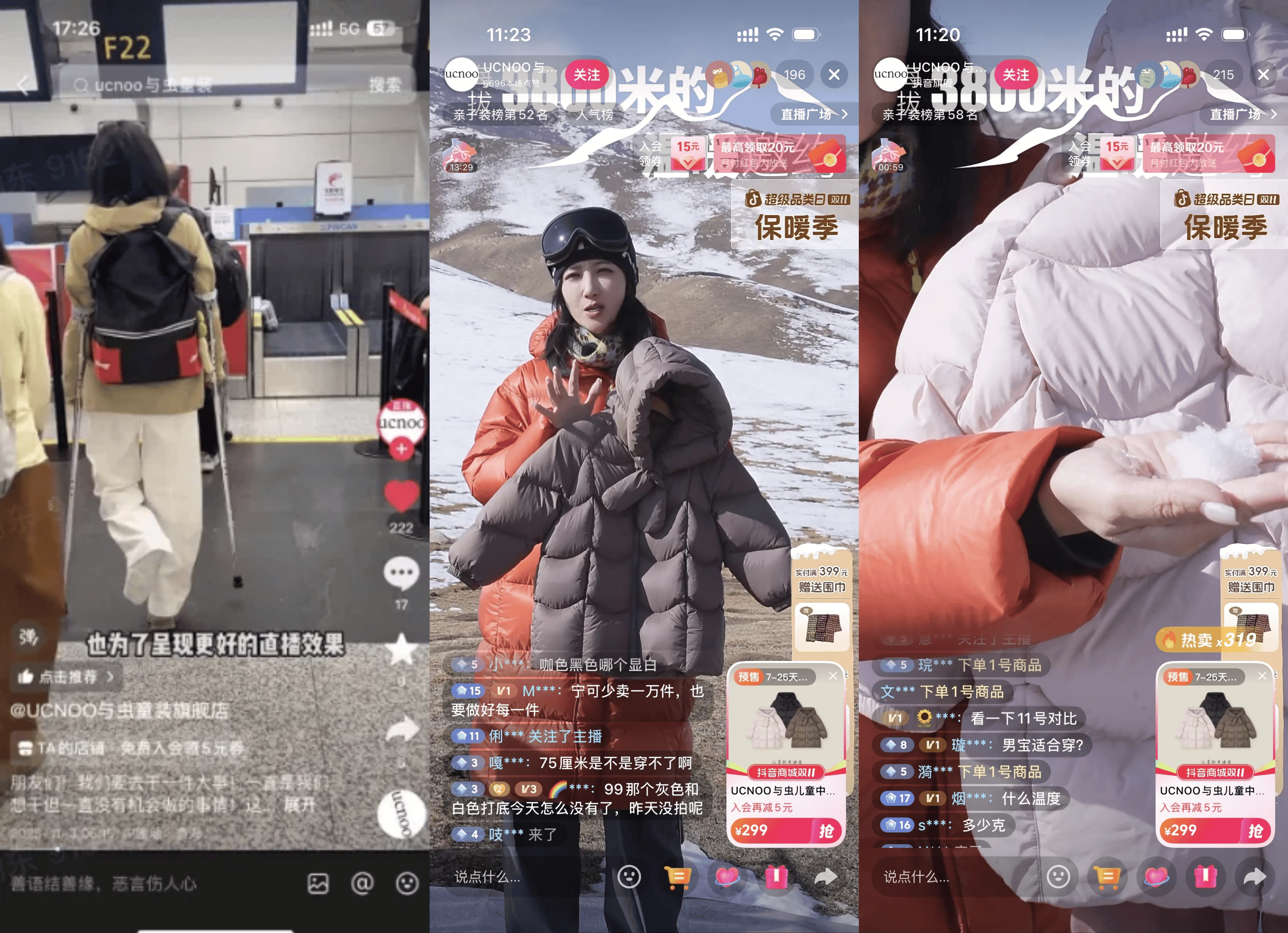 童装品牌UCNOO也深谙:消费者的信任,来自于可感知的真实体验。团队克服电力、网络、温度的重重阻碍,远赴青海西宁3200m+海拔的雪山开启直播,将“保暖”这一核心卖点转化为一场可看、可感、可信的内容体验,极大地降低了消费者的决策成本,抖音商城也化身优质内容放大器,流量的加持让这场直播精准推送给潜在客群,最终实现账号首次百万级销售额和榜单排名的大幅跃升。