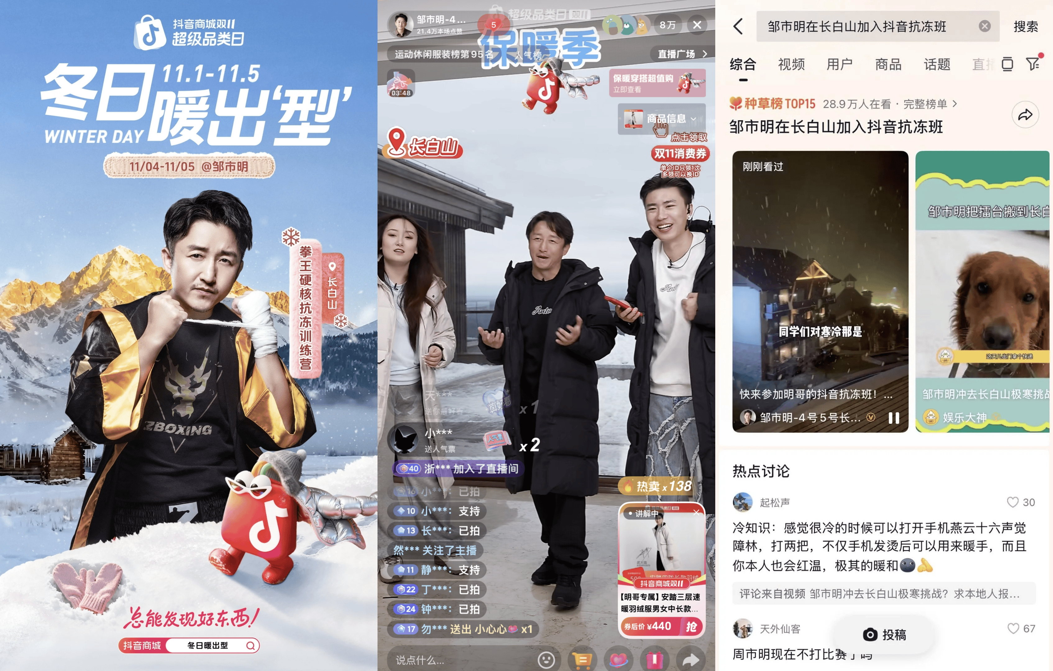 这场充满硬核实测的“内容型直播”,颠覆了传统的大促卖场模式。凭借真实性与趣味性,一举将在线人数拉升至8万+的历史新高,累计曝光突破千万。相关短视频 #邹市明在长白山加入了抖音抗冻班 也迅速登上种草榜,播放量突破473万,成功将“抗冻、高科技、专业运动员”深度绑定,内容和产品都深入人心。