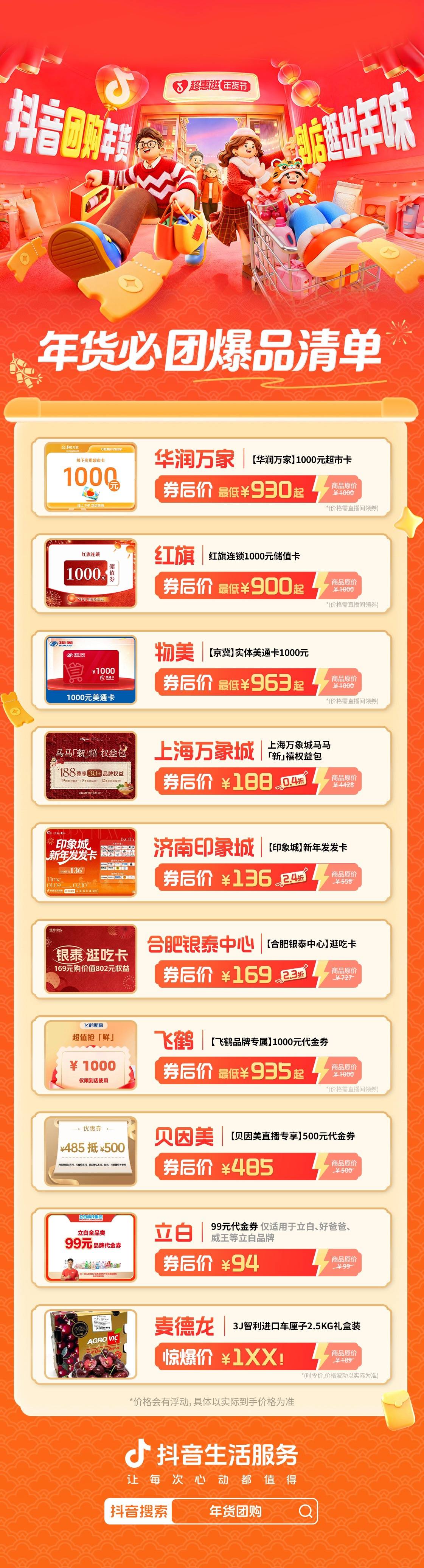 看完了吴昕、海涛的千元年货“优秀作业”示范,别忘了来抢券“实战”!活动期间,抖音搜索“年货团购”进入活动主会场,每天10点、19点最高可抢1188元年货券,从吃喝玩乐到商超爆品都能用!线上团购各类新式“年礼”,还能用定制年味礼赠卡写下独家祝福,将券直接转赠亲友,把心意即刻送达!