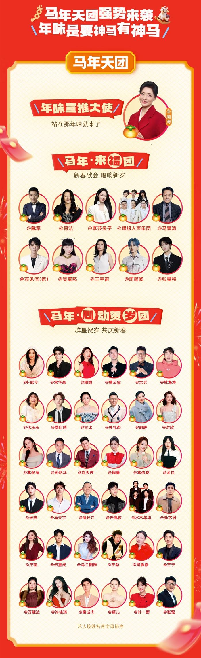 「马年·心动贺岁团」惊喜加倍,卜冠今、常华森、啜妮、曹云金、大兵、杜海涛、代乐乐、费启鸣、甘比、关礼杰、胡静、洪欣、李多海、骆达华、刘天佐、斓曦、李依晓、孟佳、米热、马天宇、潘长江、任胤菘、水木年华、孙艺洲、汪聪、伍嘉成、乌兰图雅、王勉、吴敏霞、王宁、万妮达、许佳琪、袁成杰、颖儿、叶一茜、张磊,群星贺岁,在欢声笑语中解锁马年最动人的新春仪式感。