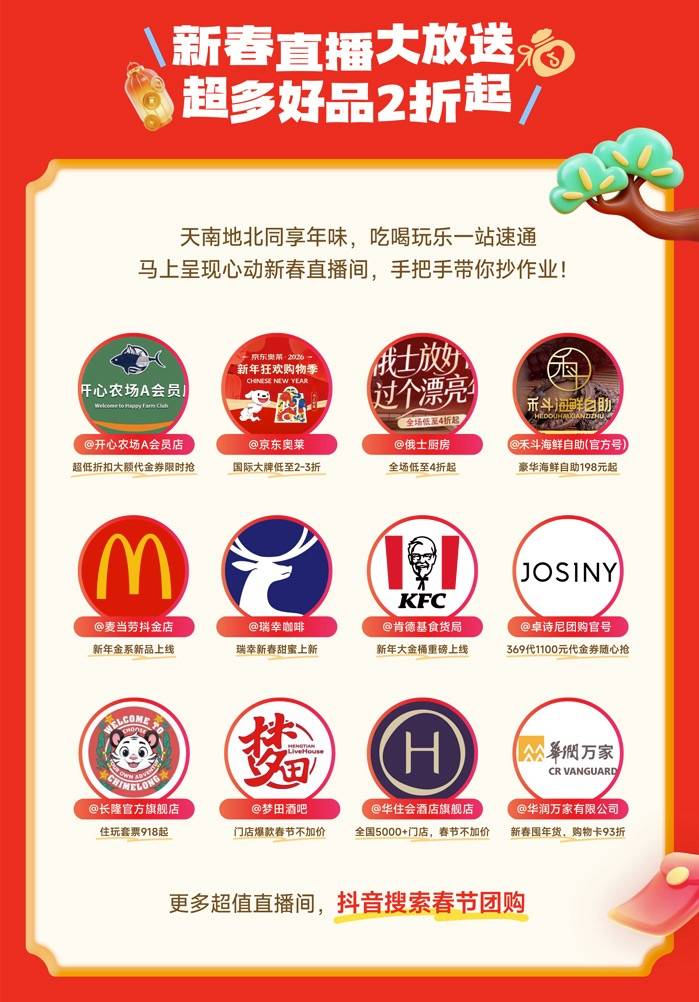 2月10日至23日,每天12:00、17:00、20:00,进入「抖音团购」频道首页,或直接搜索“春节团购”,亿元红包准时开抢,解锁所有品牌专属福利,让新年吃喝尽兴、玩乐无忧,实惠与快乐双重到位!